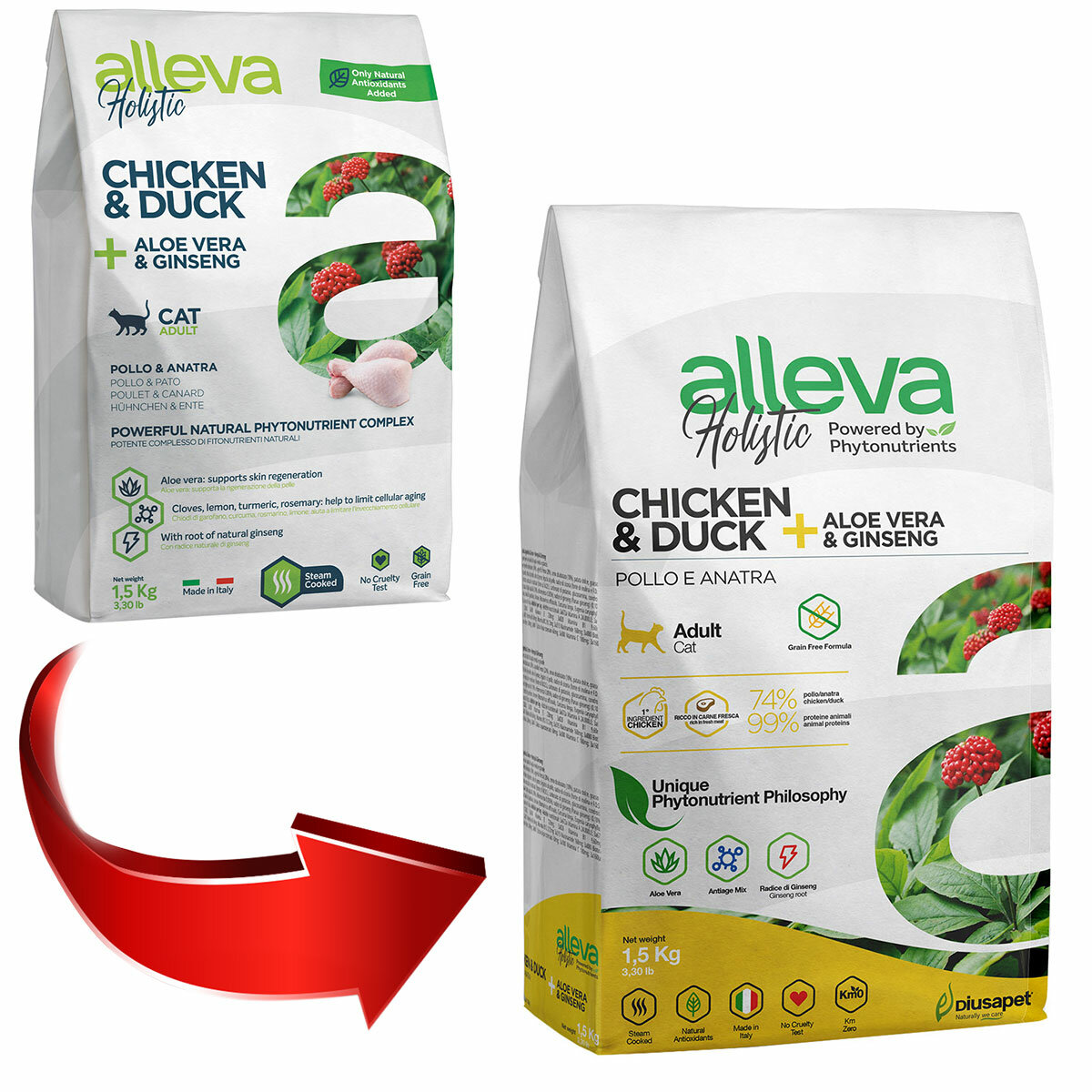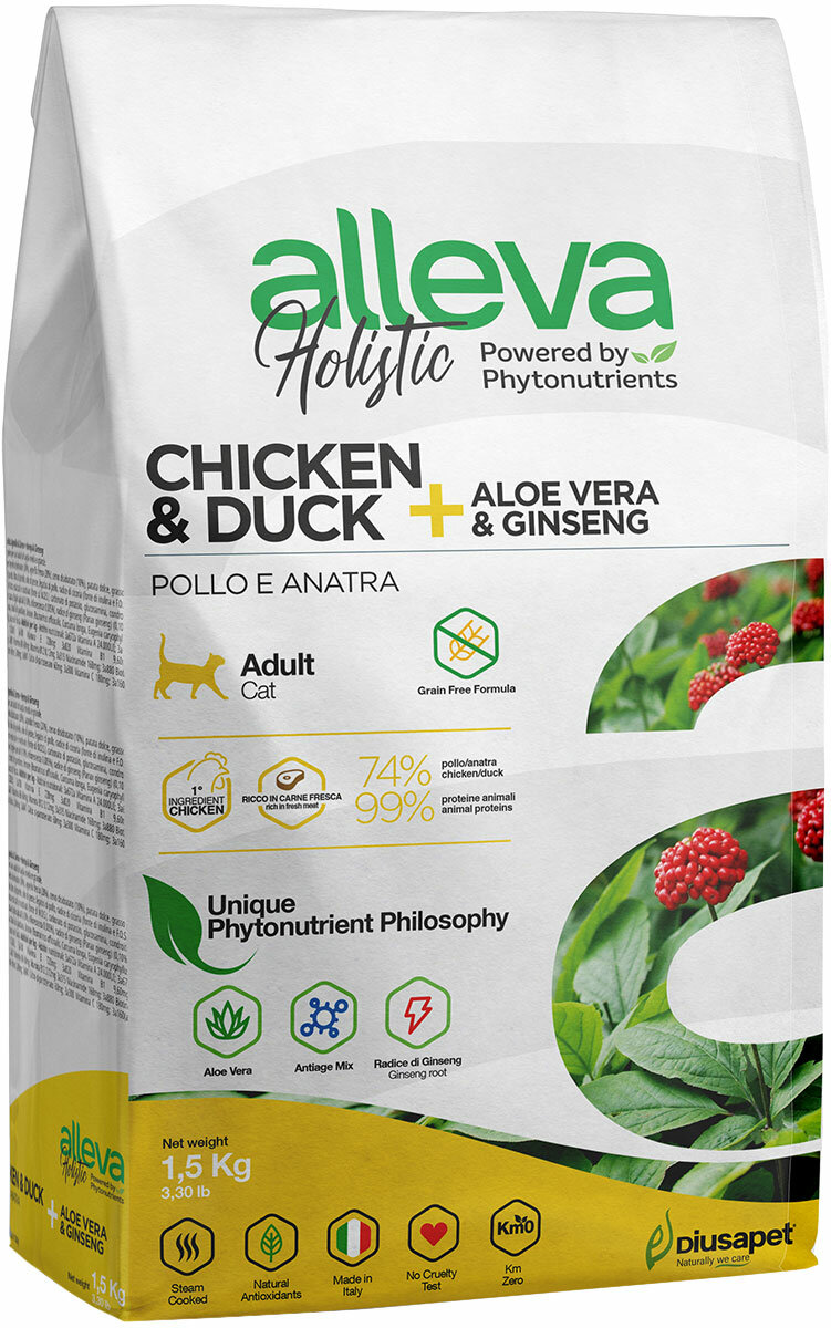 Сухой корм ALLEVA HOLISTIC CAT ADULT CHICKEN & DUCK, для взрослых котов/кошек, беззерновой, с курицей, уткой, алоэ вера и женьшенем, 1,5 кг