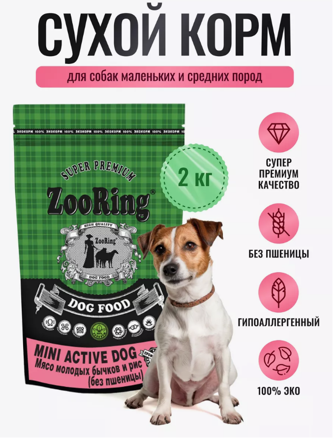 Купить ZooRing Корм сухой для активных собак мелких и средних пород Mini Active Dog Мясо молодых бычков и рис, 2 кг