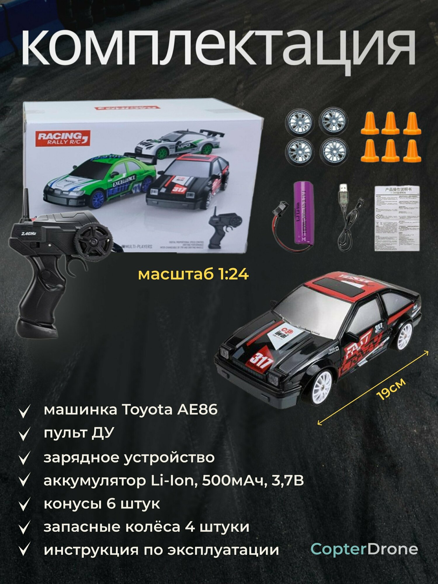 Радиоуправляемая машина для дрифта Toyota AE86 (19 см, 15 км/ч, сменные колеса, фишки) - SC24A07 (SC24A07) интересное: