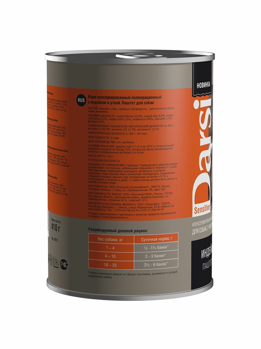 Darsi Консервы (паштет) для собак с чувствствительным пищеварением "Индейка и утка", 410г, 6 штук