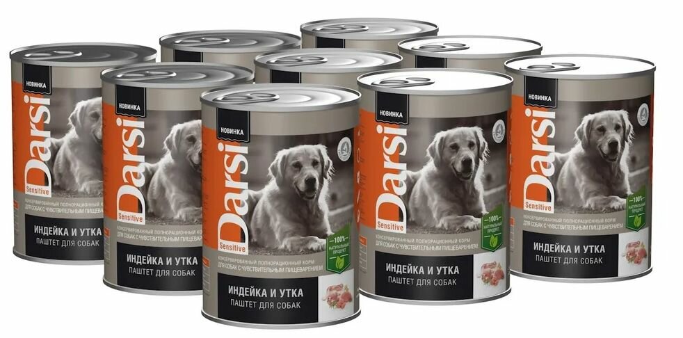 Консервы Darsi (паштет) для собак с чувствительным пищеварением Индейка и Утка, 9 шт. х 410г