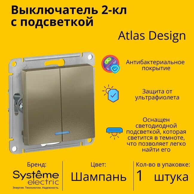 Купить Выключатель электрический Systeme Electric Atlas Design 2-клавишный с подсветкой, 10А, 10 AX, Шампань ATN000553 - 1 шт.