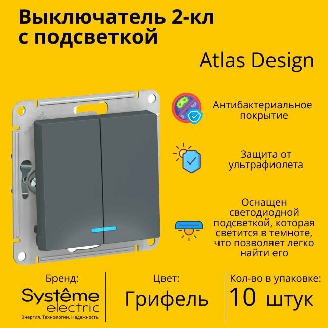 Купить Выключатель электрический Systeme Electric Atlas Design 2-клавишный с подсветкой, 10А, 10 AX, Грифель ATN000753 - 10 шт.