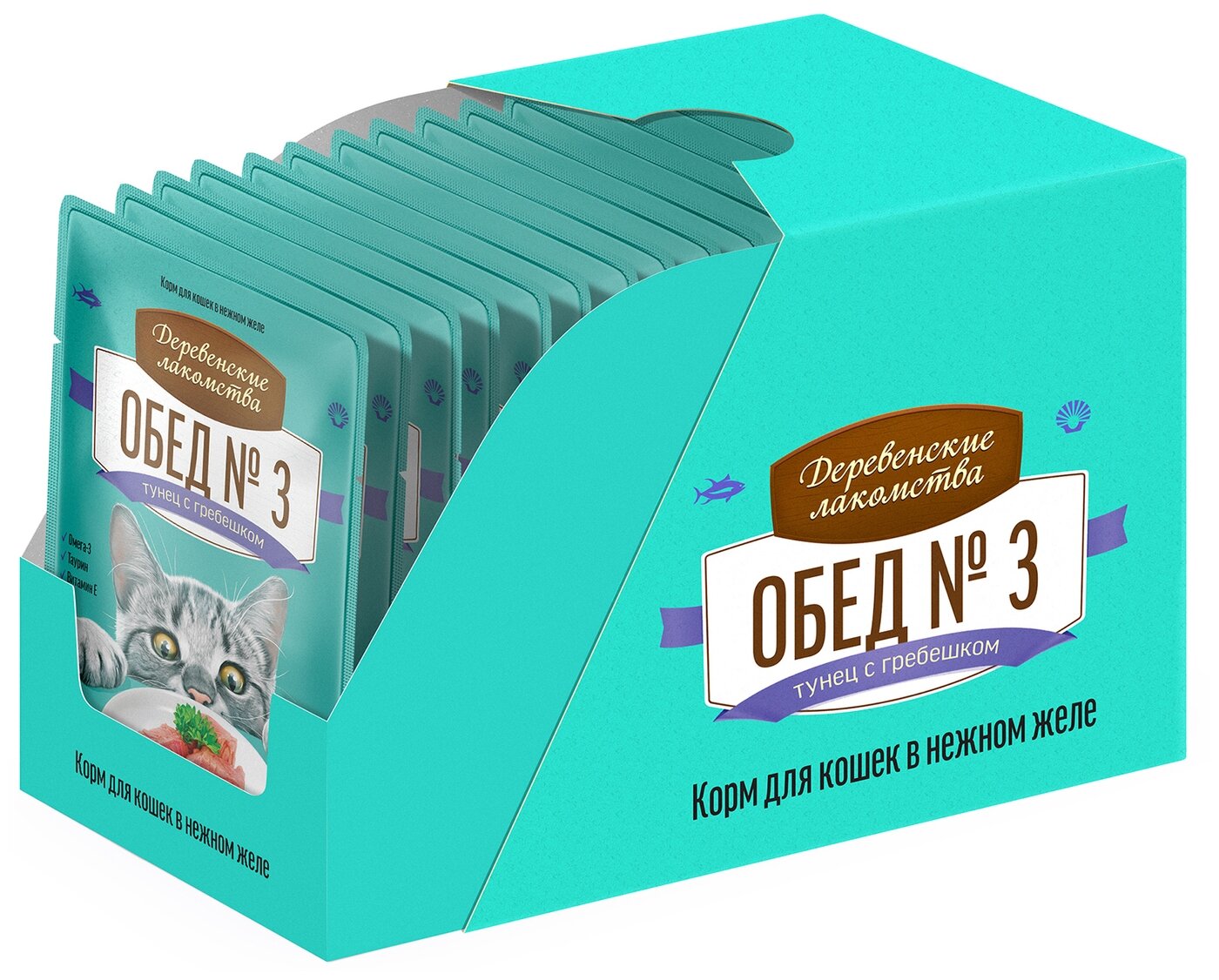 Влажный корм для кошек Деревенские лакомства Обед №3, с тунцом, с гребешком 12 шт. х 50 г (кусочки в желе)