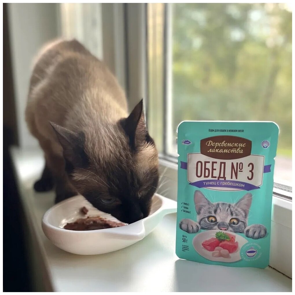Влажный корм для кошек Деревенские лакомства Обед №3, с тунцом, с гребешком 50 г (кусочки в желе)