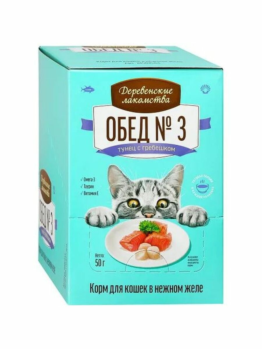 Деревенские лакомства обед № 3 для взрослых кошек с тунцом и гребешком в желе 50 гр (50 гр х 12 шт)