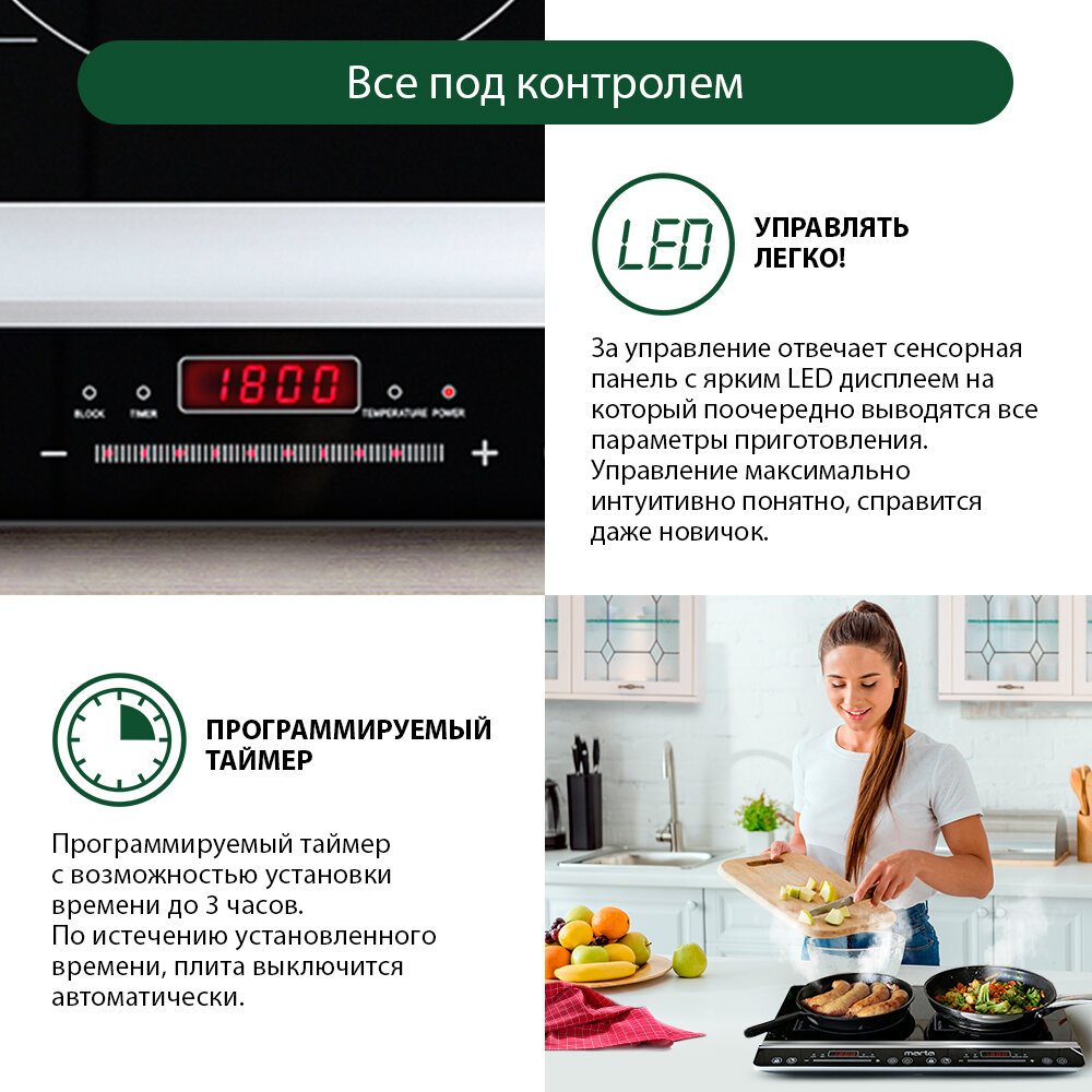 Индукционная плита настольная 2 конфорки, 4400 Вт интересное: