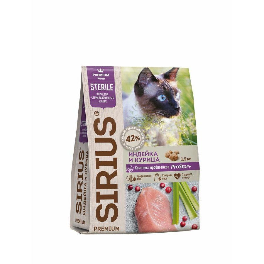 Сухой корм сириус SIRIUS PREMIUM для стерилизованных кошек, индейка и курица, 1.5 кг