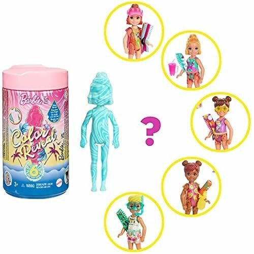 Кукла Barbie GTT25 Chelsea Color Reveal, набор Sand Sun, с эффектом раскрытия с 1 куклой-сюрпризом и 6 другими сюрпризами, игрушка для детей от 3 до 8 лет интересное: