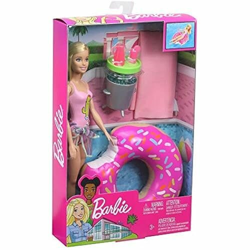 Кукла Barbie GHT20 Blonde и игровой набор с купальником, кругом для плавания Пончик (который действительно плавает), столиком, полотенцем, графином и стаканом, подарок для детей от 3 до 7 лет интересное: