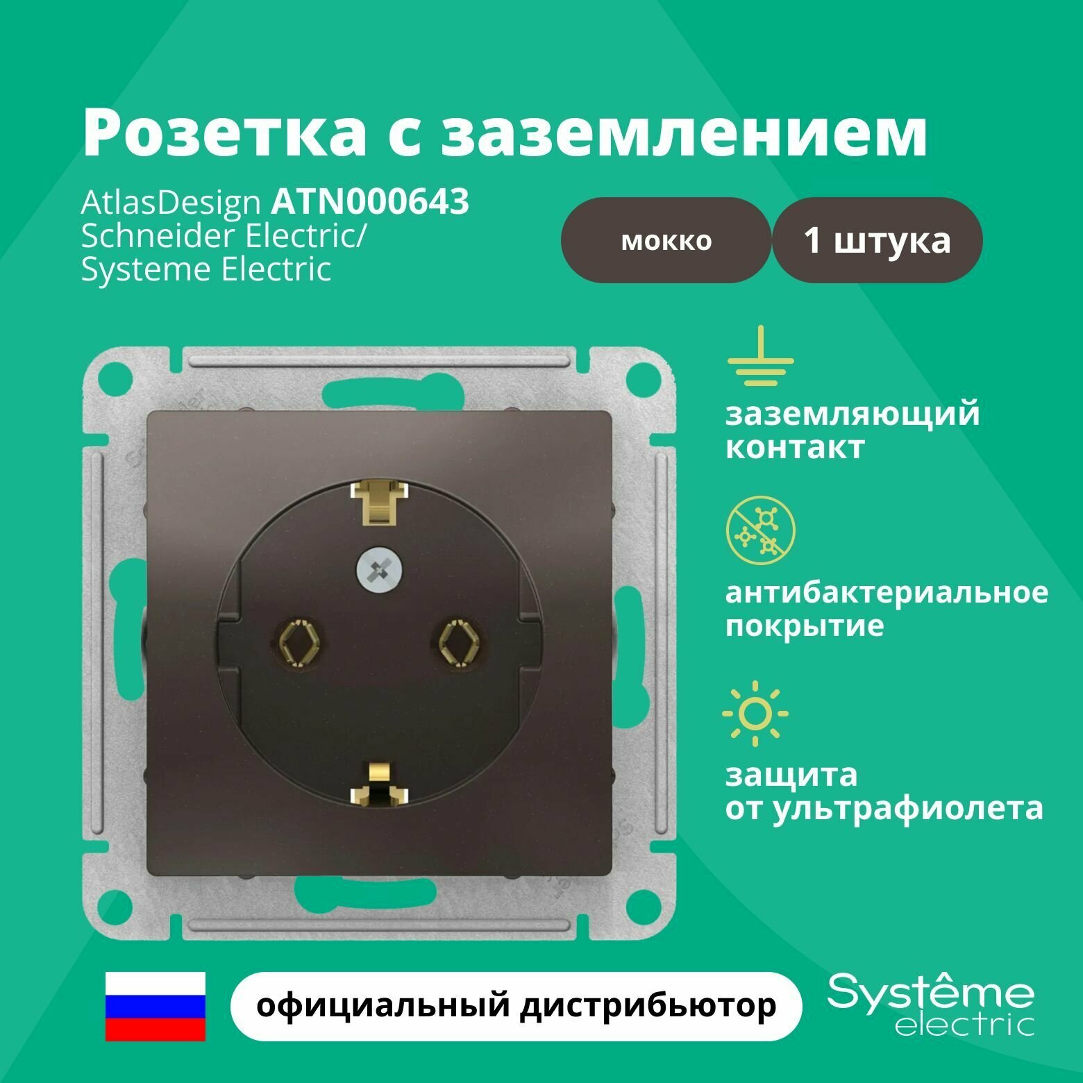 10 шт. Systeme Electric AtlasDesign Изумруд, Розетка c заземлением со шторками, 16А, механизм, ATN000845