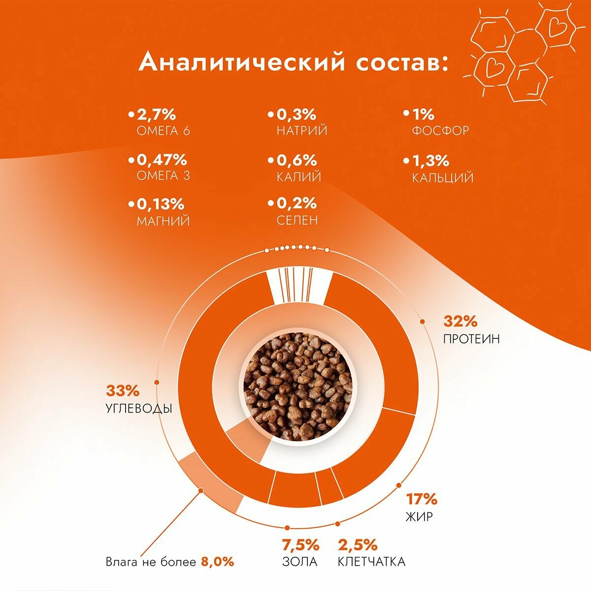 | Пищевая ценность | сырой протеин 32,0%, сырой жир 17,0%, сырая клетчатка 2,5%, сырая зола 7,5%, углеводы 33,0%, кальций 1,3%, фосфор 1,0-1,1%, натрий 0,3%, калий 0,6%, лизин 3,0%, метионин+цистин 1,0%, триптофан 0,2% омега-3 жирные кислоты 0,47%, омега-6 жирные кислоты 2,7%, влага не более 8,0% |