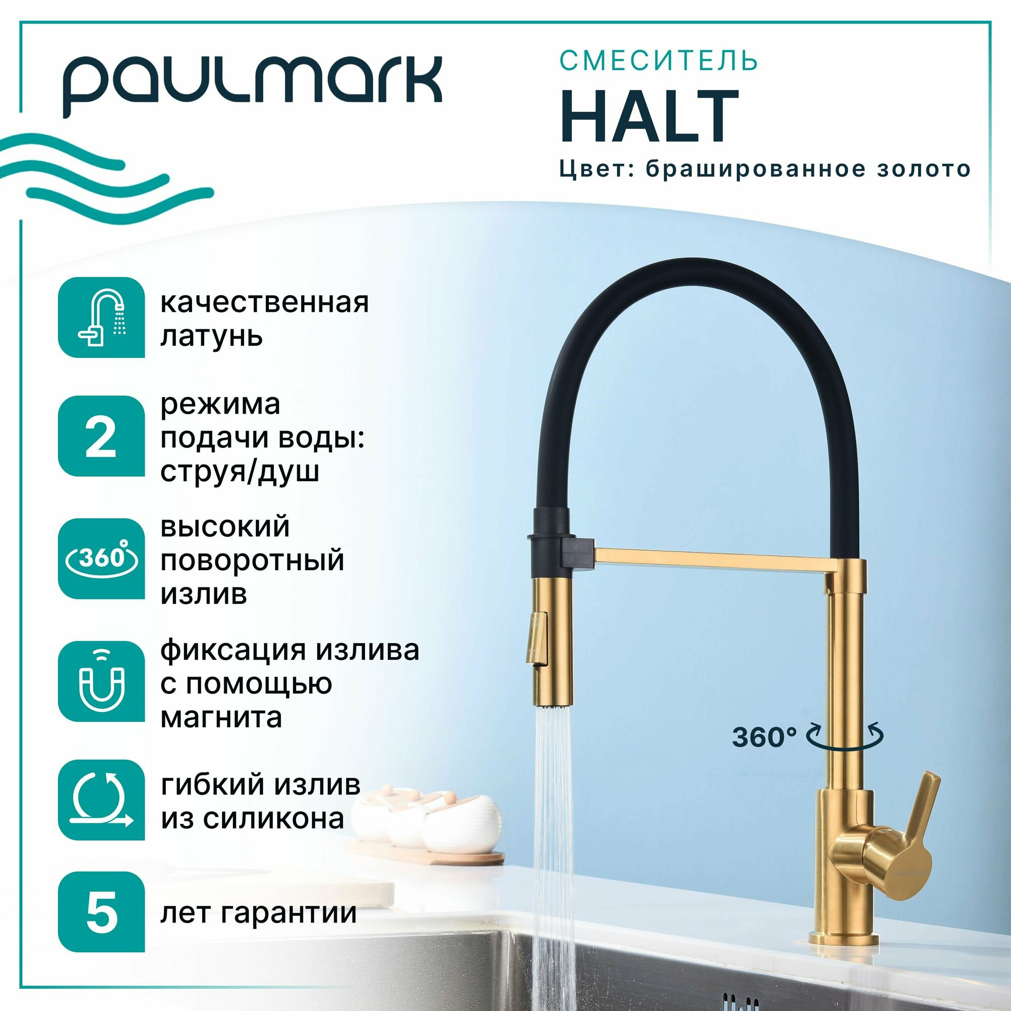 Смеситель для кухни Paulmark Halt Ha214021-G с гибким изливом золото