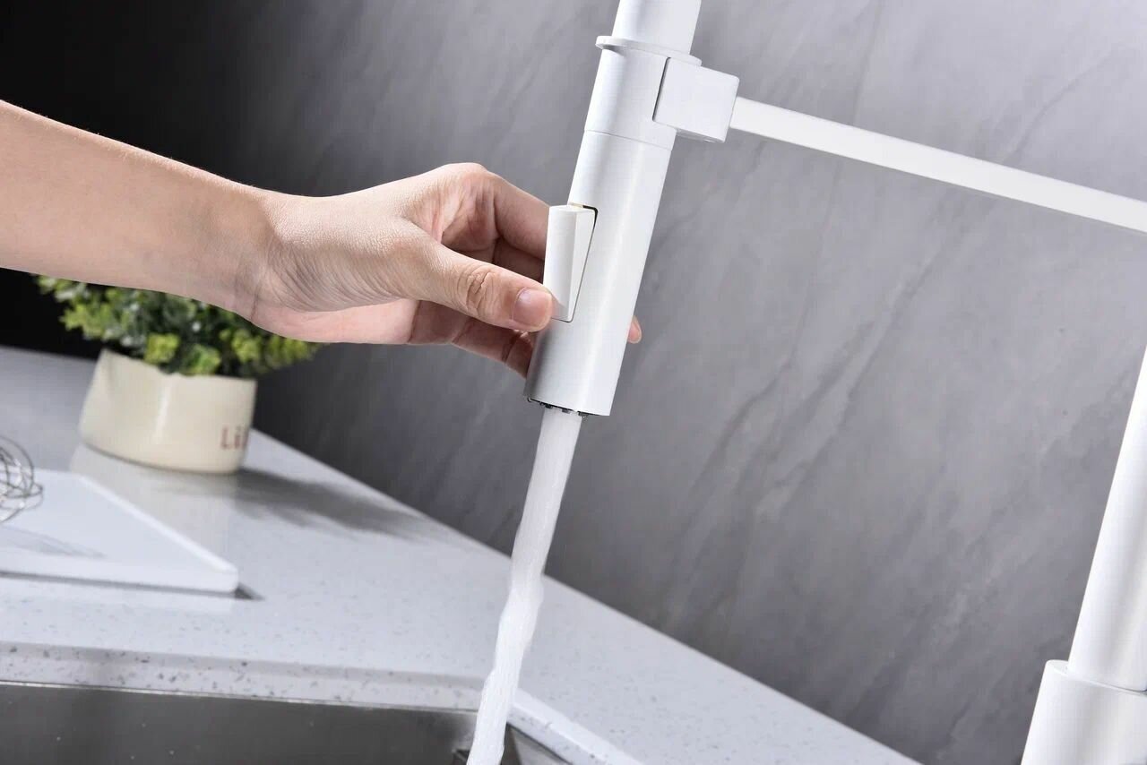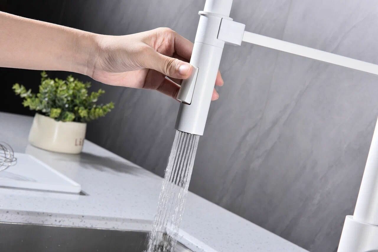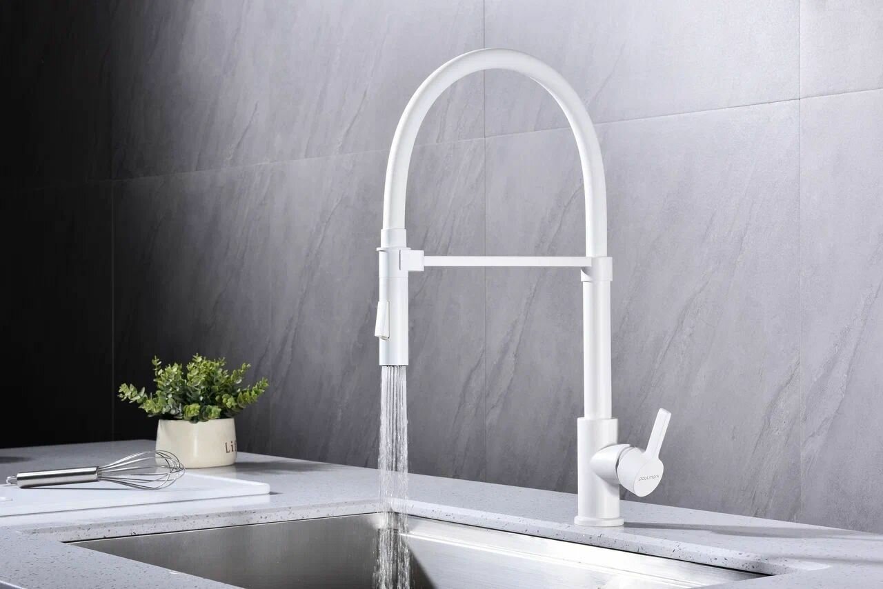 СохранитьКухонный смеситель с гибким изливом Paulmark HALT, магнитная фиксация эластичного излива, режимы струя / душ, однорычажный, латунь, на мойку / столешницу, белый матовый, Ha214021-431 интересное: