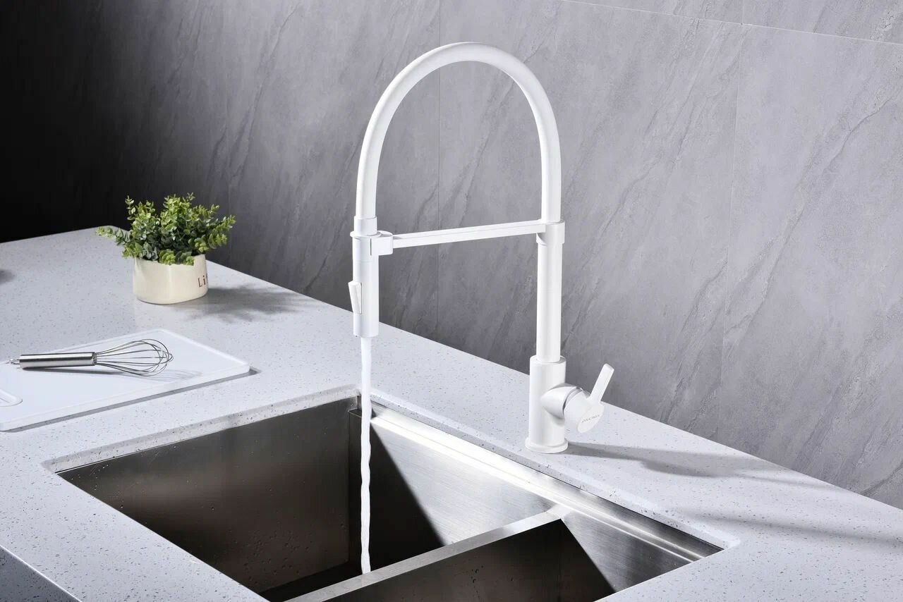 Смеситель для кухни из нержавеющей стали AISI 304 Paulmark HELLER с подключением к системе фильтрации воды, высокий поворотный на 360 излив, на мойку / столешницу, белый матовый, He213218-431