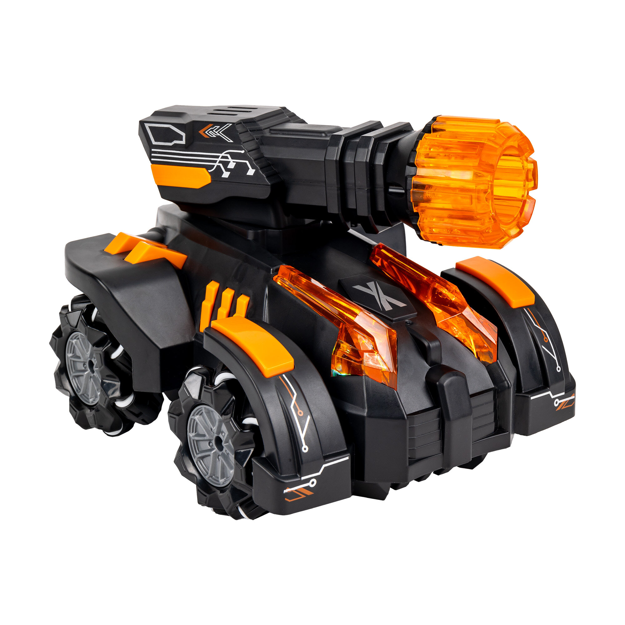 | Дополнительная информация | генератор пара, оснащены инфракрасной пушкой, всенаправленные-роликовые колёса Mecanum, у модели «три жизни», короткое нажатие на кнопку «огонь» – обычный выстрел, забирает одну «жизнь», длинное нажатие (2-3сек) на кнопку «огонь» - сильный выстрел, сразу поражает противника, при стрельбе имитируется звук выстрела и откат, вращение на 360 градусов, башки поворачиваются на 160° |