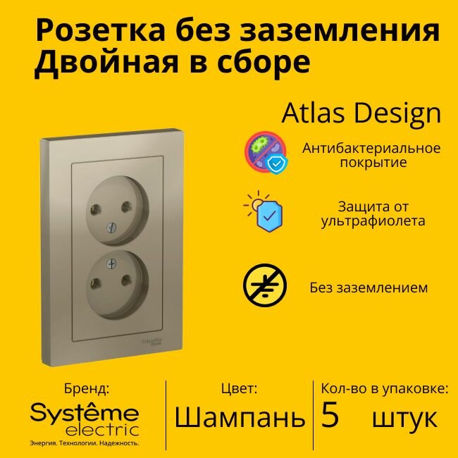 Купить Розетка электрическая двухместная Systeme Electric Atlas Design без заземления в сборе 16А, Шампань ATN000520 - 5 шт.