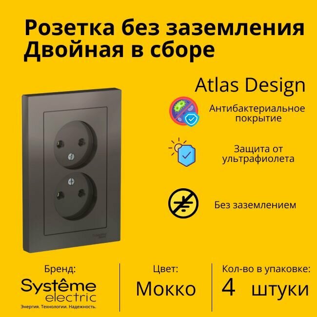 Купить Розетка электрическая двухместная Systeme Electric Atlas Design без заземления в сборе 16А, Мокко ATN000620 - 4 шт.