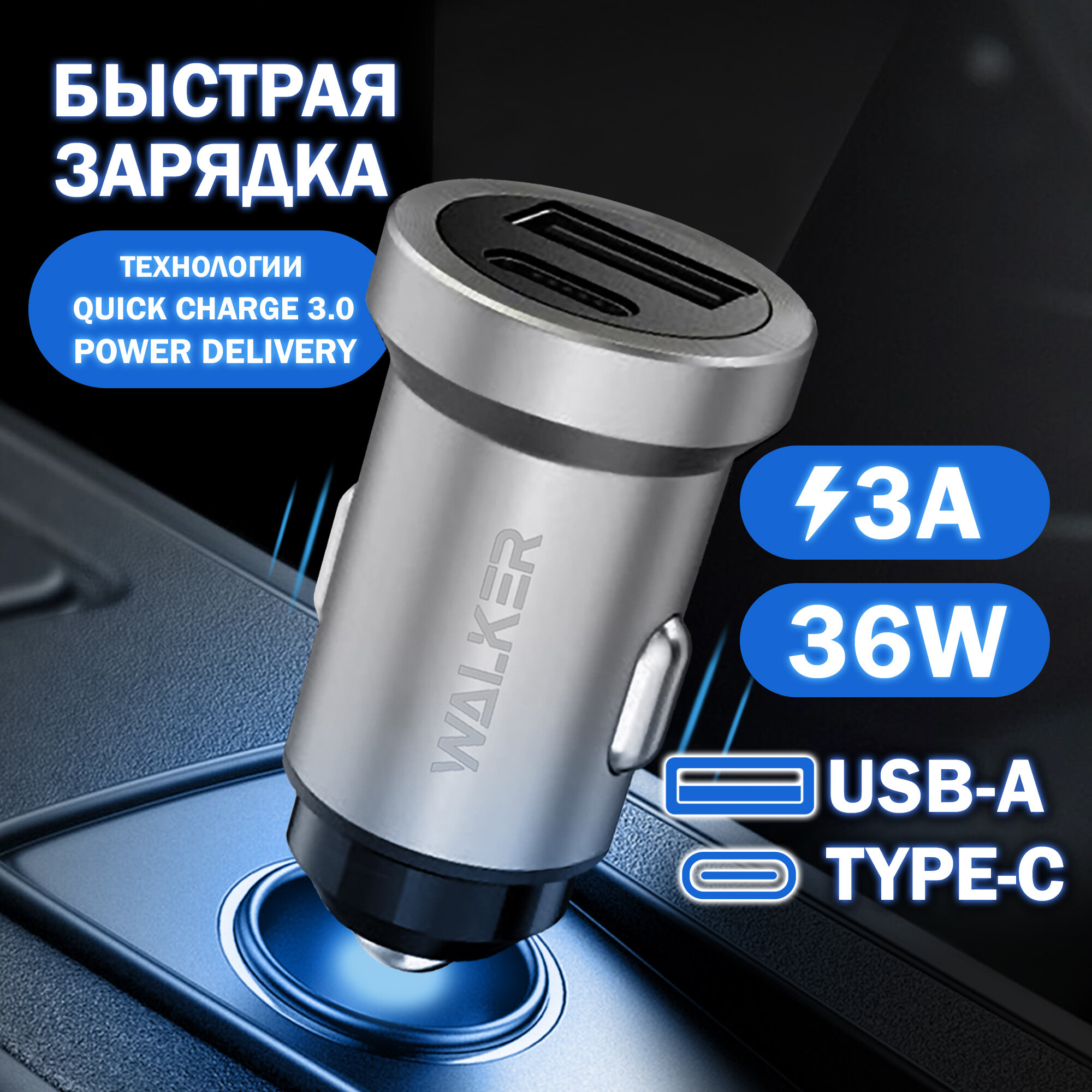 Автомобильная зарядка для гаджетов, WALKER, WCR-25, USB-А Type-C разъемы, 36W, быстрая зарядка, зарядное устройство айфон, андроид, серебряная