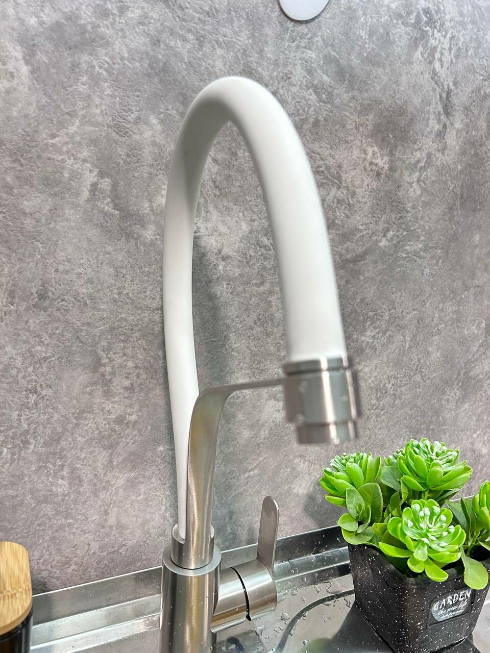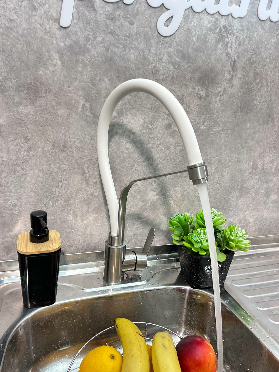 Смеситель Hansen для кухни, однорычажный, из нержавеющей стали Сатин с гибким изливом, Белый HN54043-GF