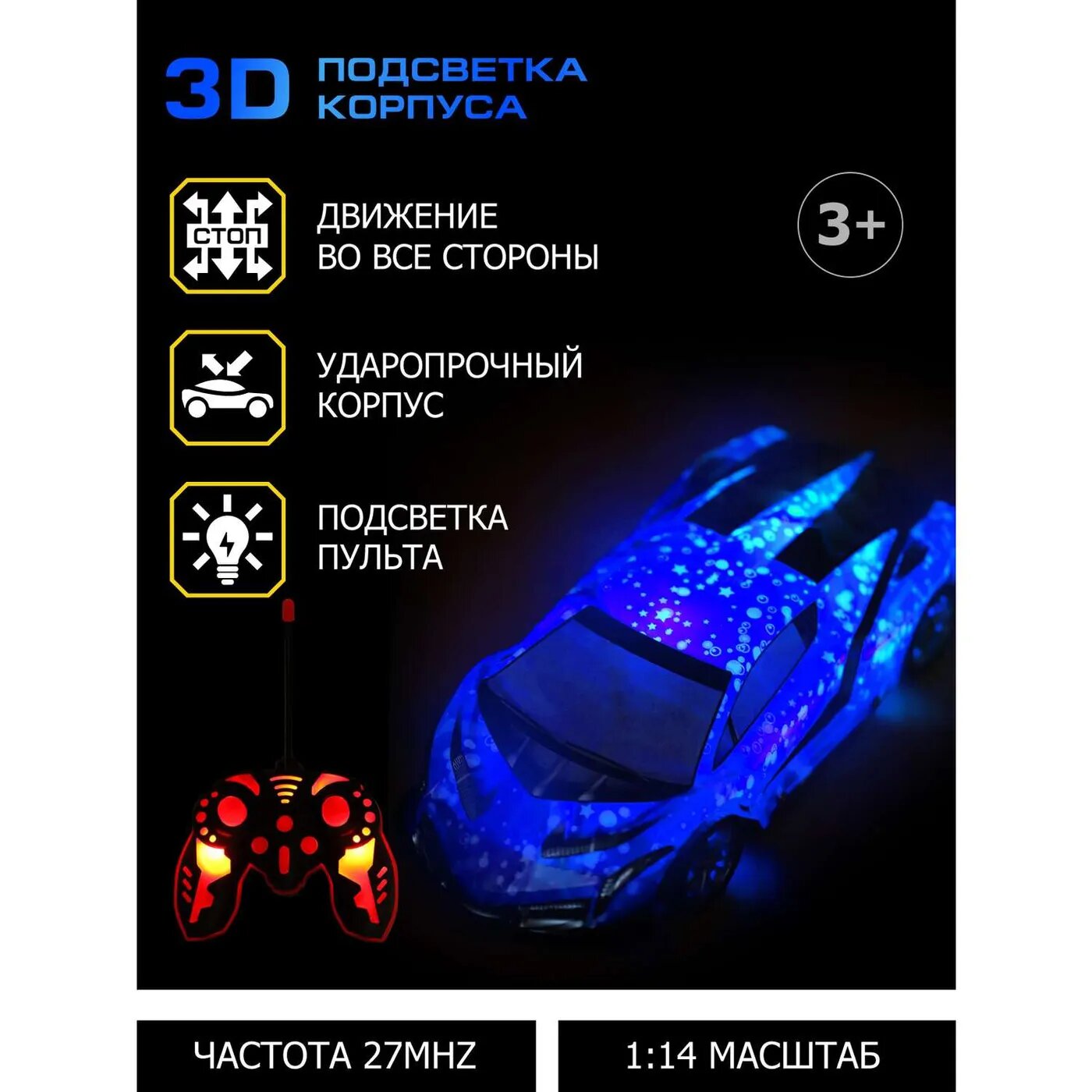 Купить Радиоуправляемая машина ТМ Джамбо Тойз с 3D подсветкой корпуса/пульта, для детей, для мальчиков, 4 канала, М 1:14, пульт управления, синий