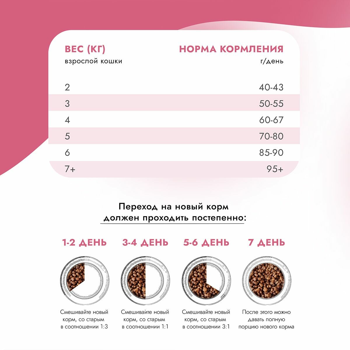 | Дозировка | Вес животного (кг) - Суточная норма кормления (г) 2 - 40-43 3 - 50-55 4 - 60-65 5 - 70-80 6 - 85-95 7+ - 90+ |