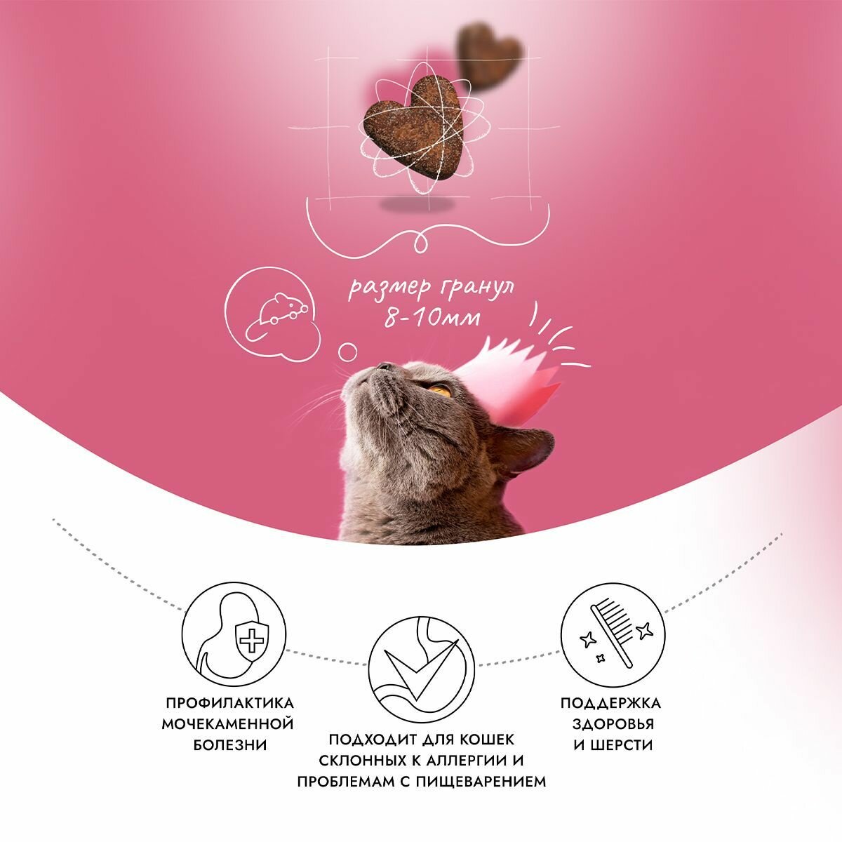 | Плюсы: | Упаковка с зип замком, что очень удобно, размер корма средний в виде сердечек, запах приятный, состав хороший. |