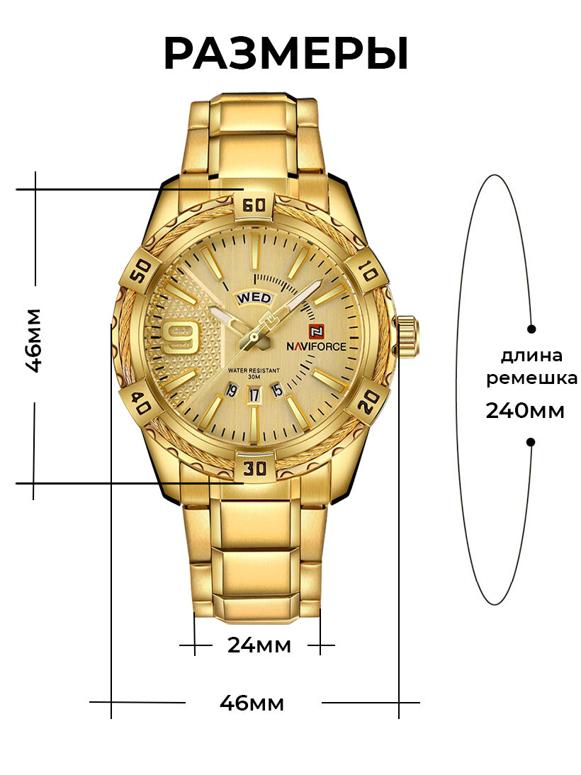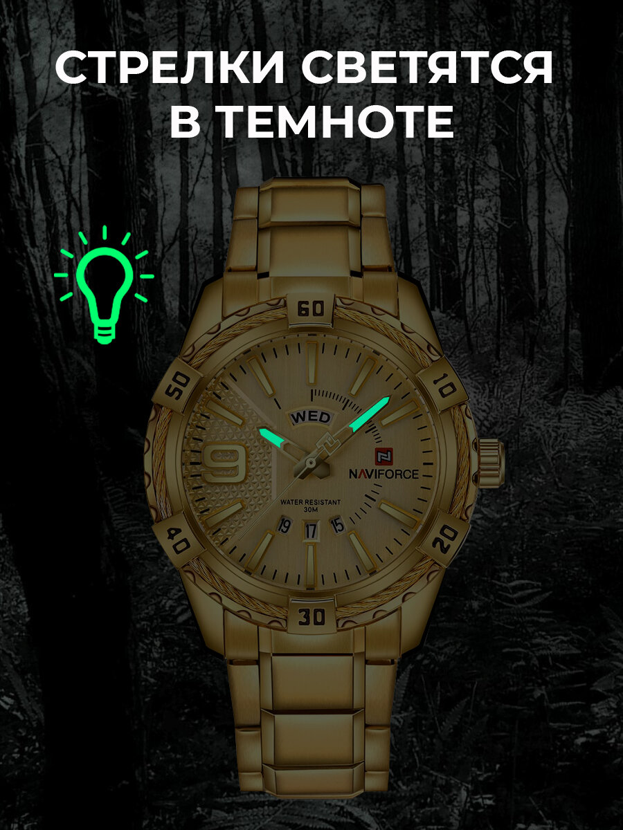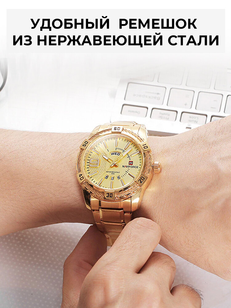 Часы наручные мужские кварцевые Naviforce металлические, круглые, золотистые интересное: