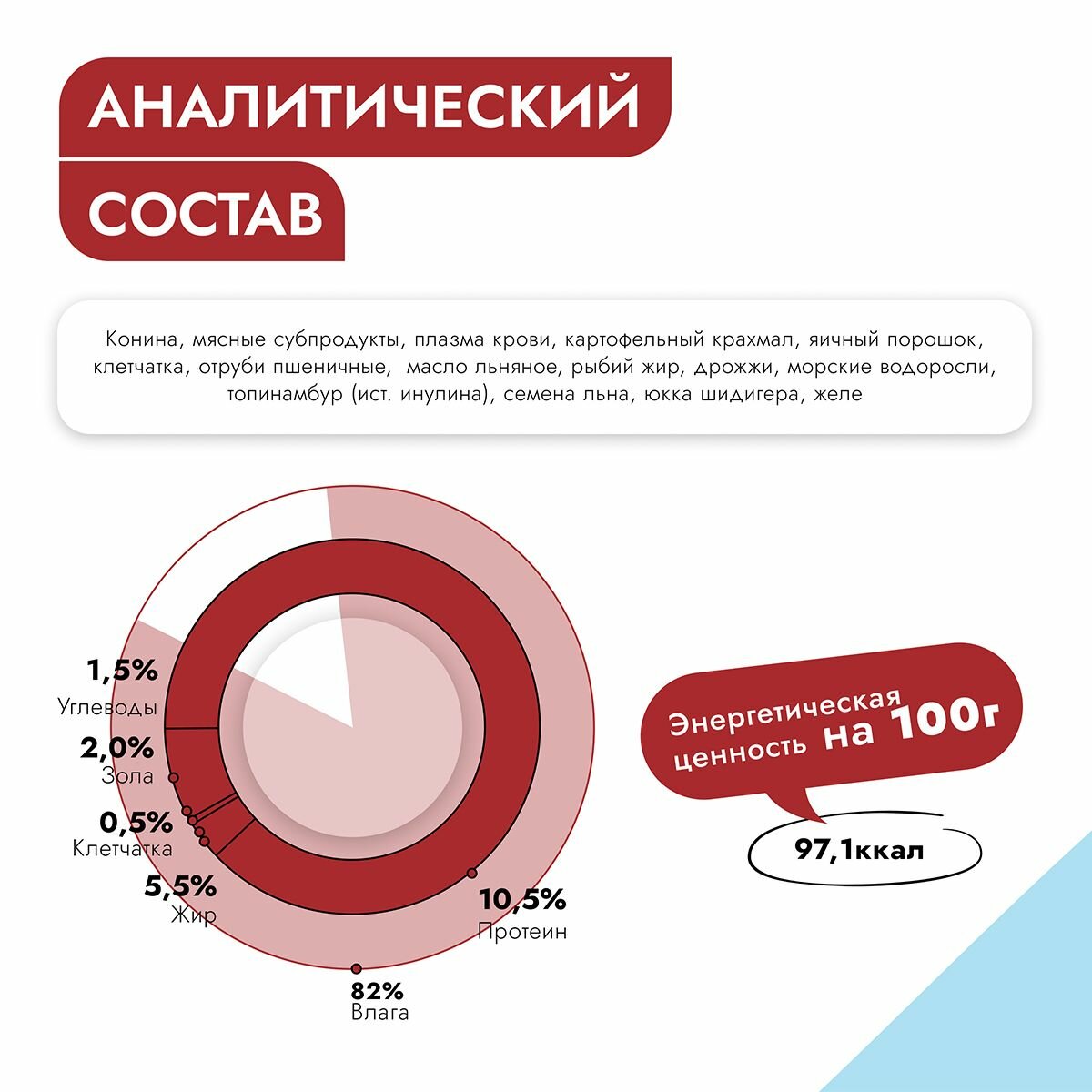 | Плюсы: | Хорошая консистенция, нету жира, мало субпродуктов, банка набита до самого верха, состав -конина, при кормлении не выявилось никаких аллергий и желудочно-кишечного расстройства |