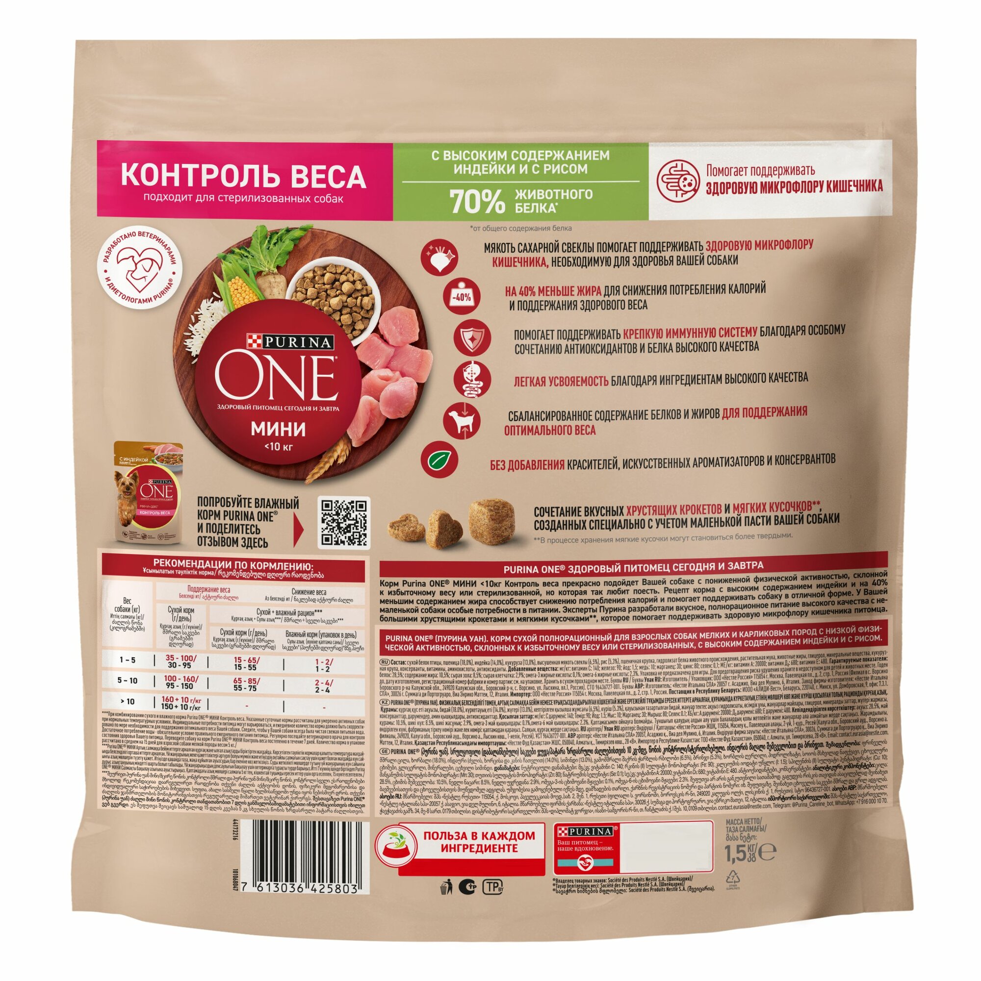 PURINA ONE мини контроль веса для взрослых собак маленьких пород с индейкой и рисом (1,5 кг х 6 шт)