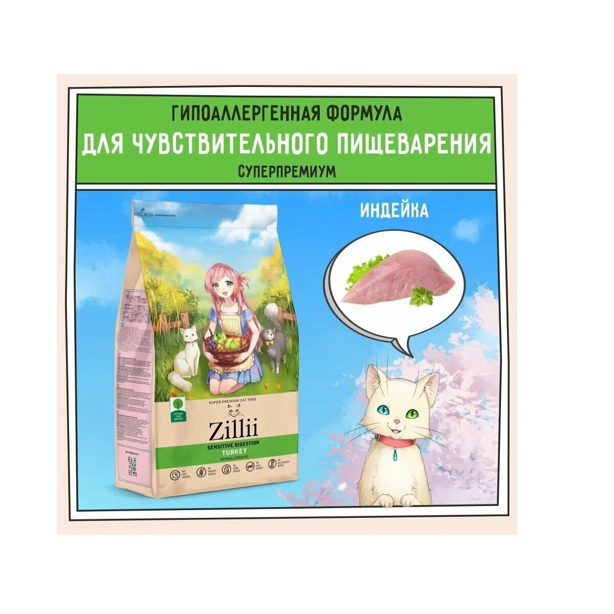 Корм для кошек сухой с чувствительным пищеварением 2 кг, гипоаллергенный ZILLII (Зилли), Индейка