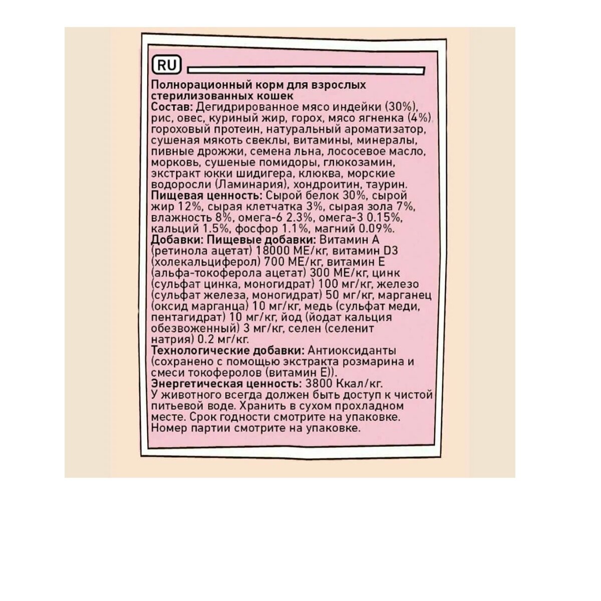 | Пищевая ценность | Сырой белок 30%, сырой жир 12%, сырая клетчатка 3%, сырая зола 7%, влажность 8%, омега-6 2.3%, омега-3 0.15%, кальций 1.5%, фосфор 1.1%, магний 0.09% |