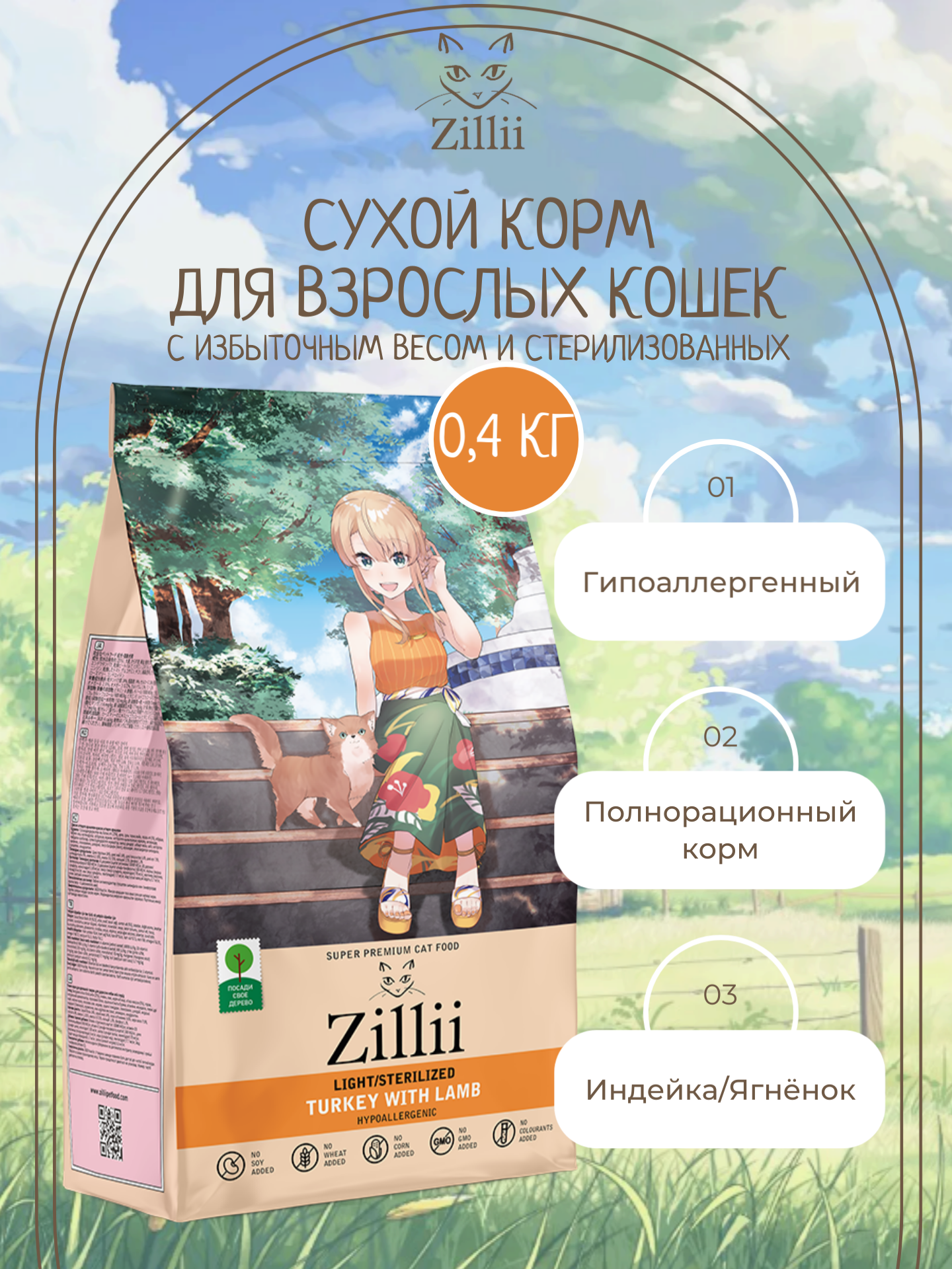 Корм сухой для кошек стерилизованных и с избыточным весом 400 г, гипоаллергенный ZILLII (Зилли) Light/Sterilized Cat, Индейка с Ягнёнком