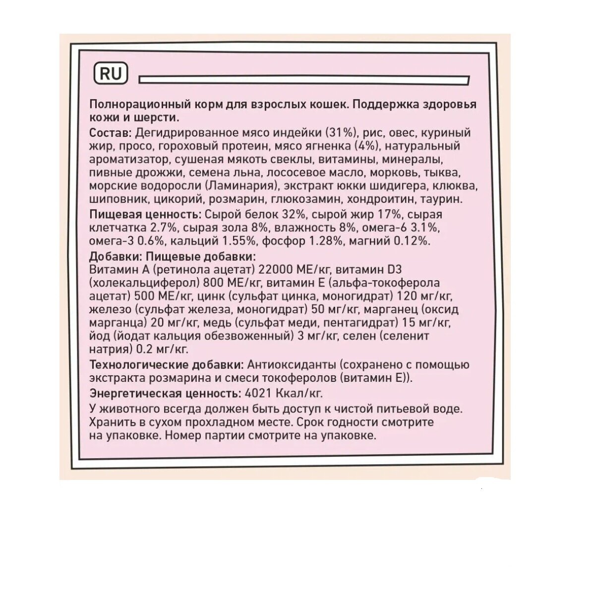 | Пищевая ценность | Сырой белок 30%, сырой жир 12%, сырая клетчатка 3%, сырая зола 7%, влажность 8%, омега-6 2.3%, омега-3 0.15%, кальций 1.5%, фосфор 1.1%, магний 0.09% |