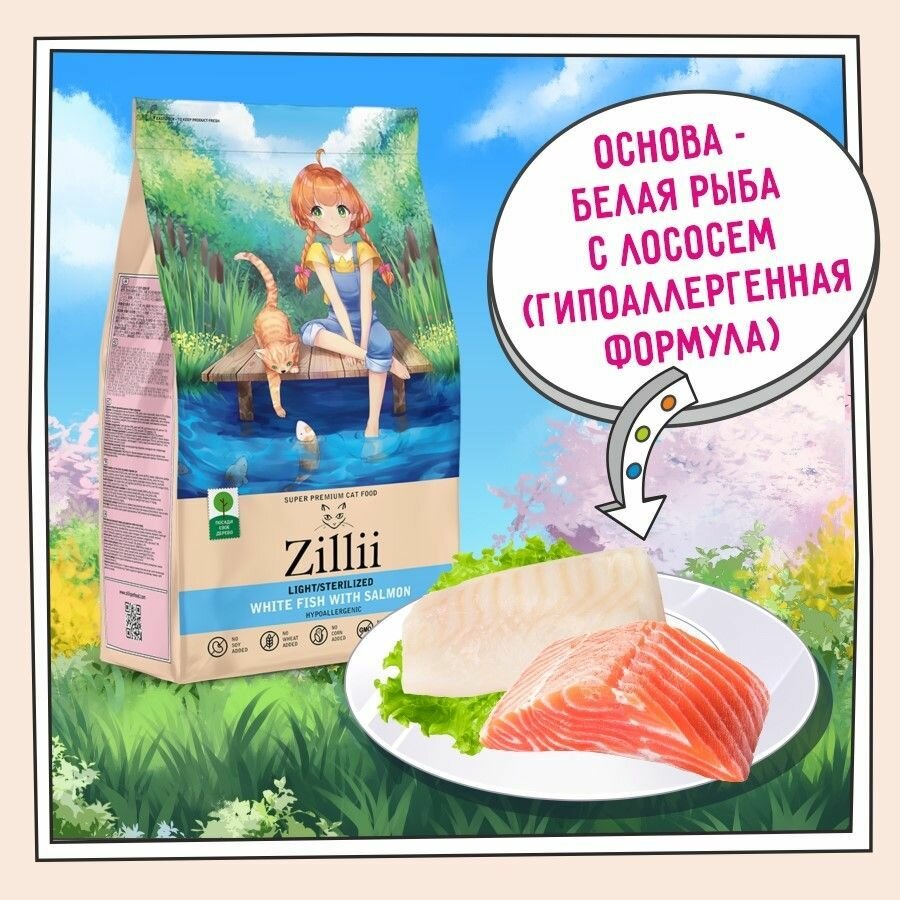 Корм сухой для кошек стерилизованных и с избыточным весом 2 кг, гипоаллергенный ZILLII (Зилли) Light/Sterilized Cat, Белая Рыба с Лососем