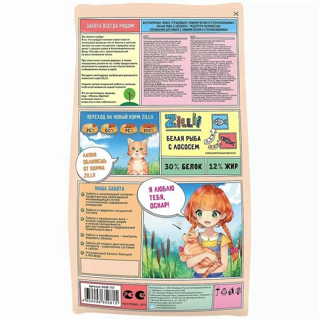 Купить ZILLII Light/Sterilized Cat Сухой корм для взр. кошек с избыт. весом и стерил. Бел.Рыба Лосось 2кг