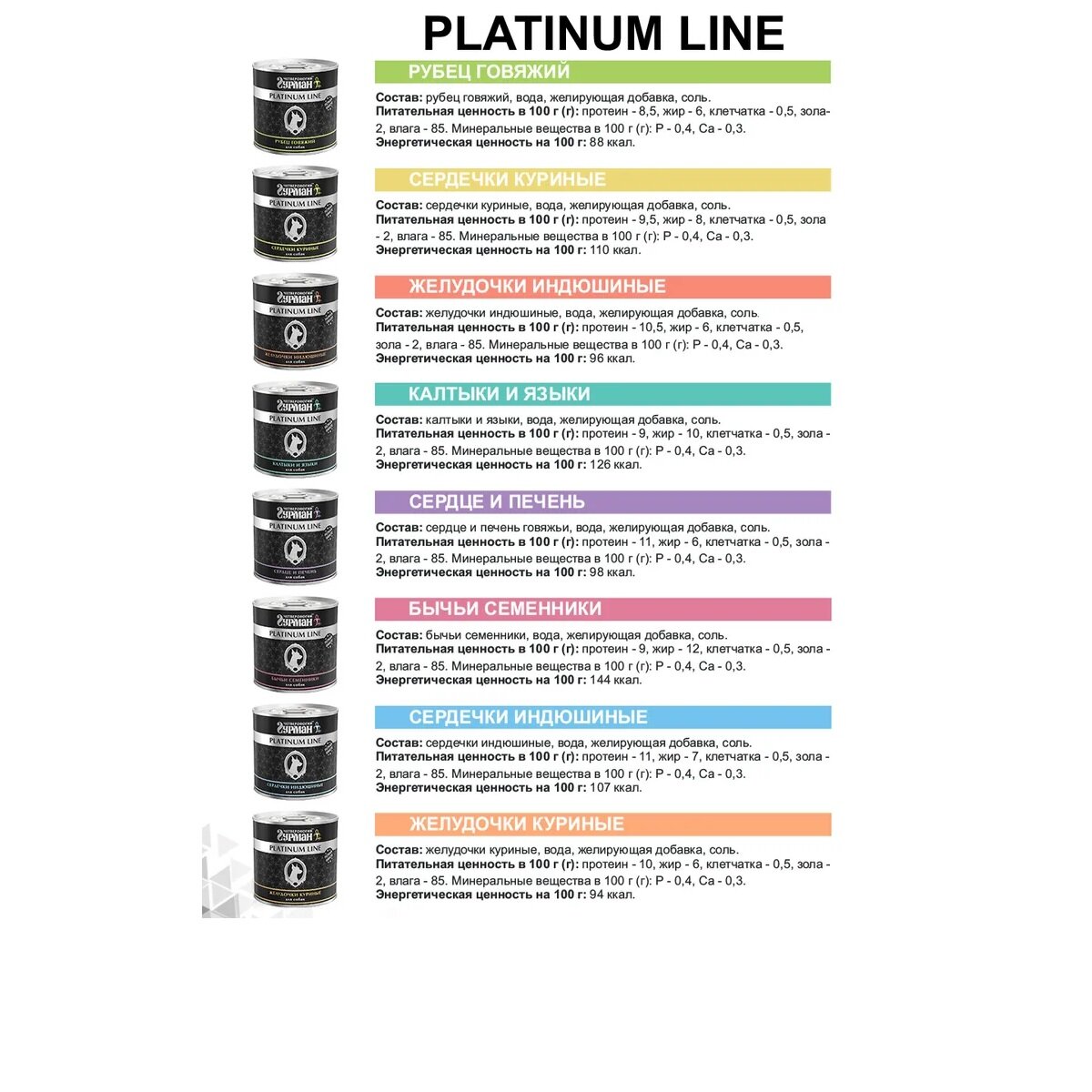 | Пищевая ценность | сырой протеин – не менее 11 г, сырой жир – не более 7 г, влага – не более 85, клетчатка – не более 0,5, сырая зола – не более 2, массовая доля поваренной соли – 0,3%. |