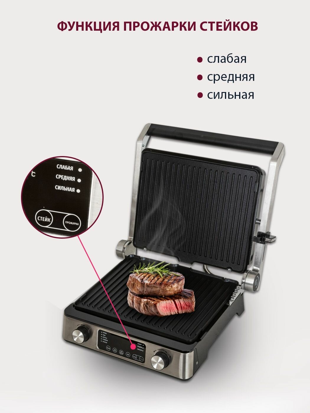 | Отзыв: | хорошие стейки. и Венские вафли печёт хорошо, равномерно. удобное управление. равномерный нагрев. Есть термо щуп. сначала был запах пластика, но после первого использования прошёл. |