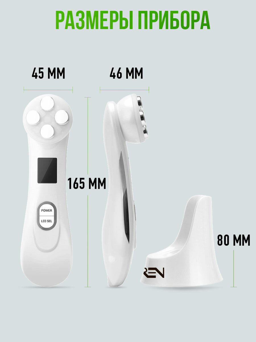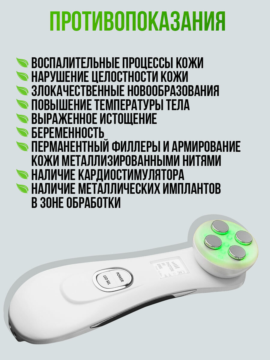 | Принцип работы | RF-лифтинг / инфракрасное излучение / ионизация / микротоки / миостимуляция / светотерапия / ультразвук / фонофорез / электропорация |