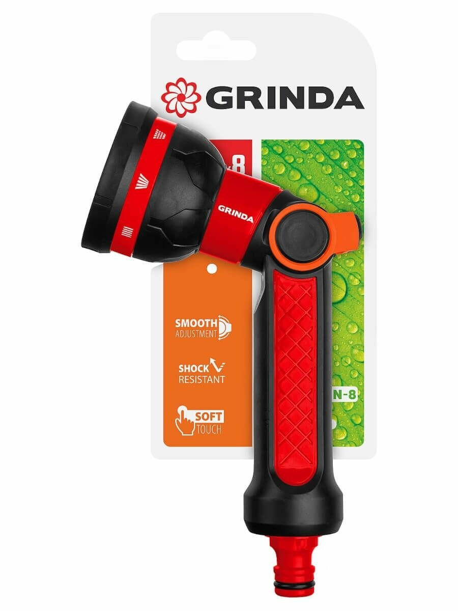 Пистолет поливочный двухкомпонентный с регулятором напора N-8, 8 режимов, GRINDA