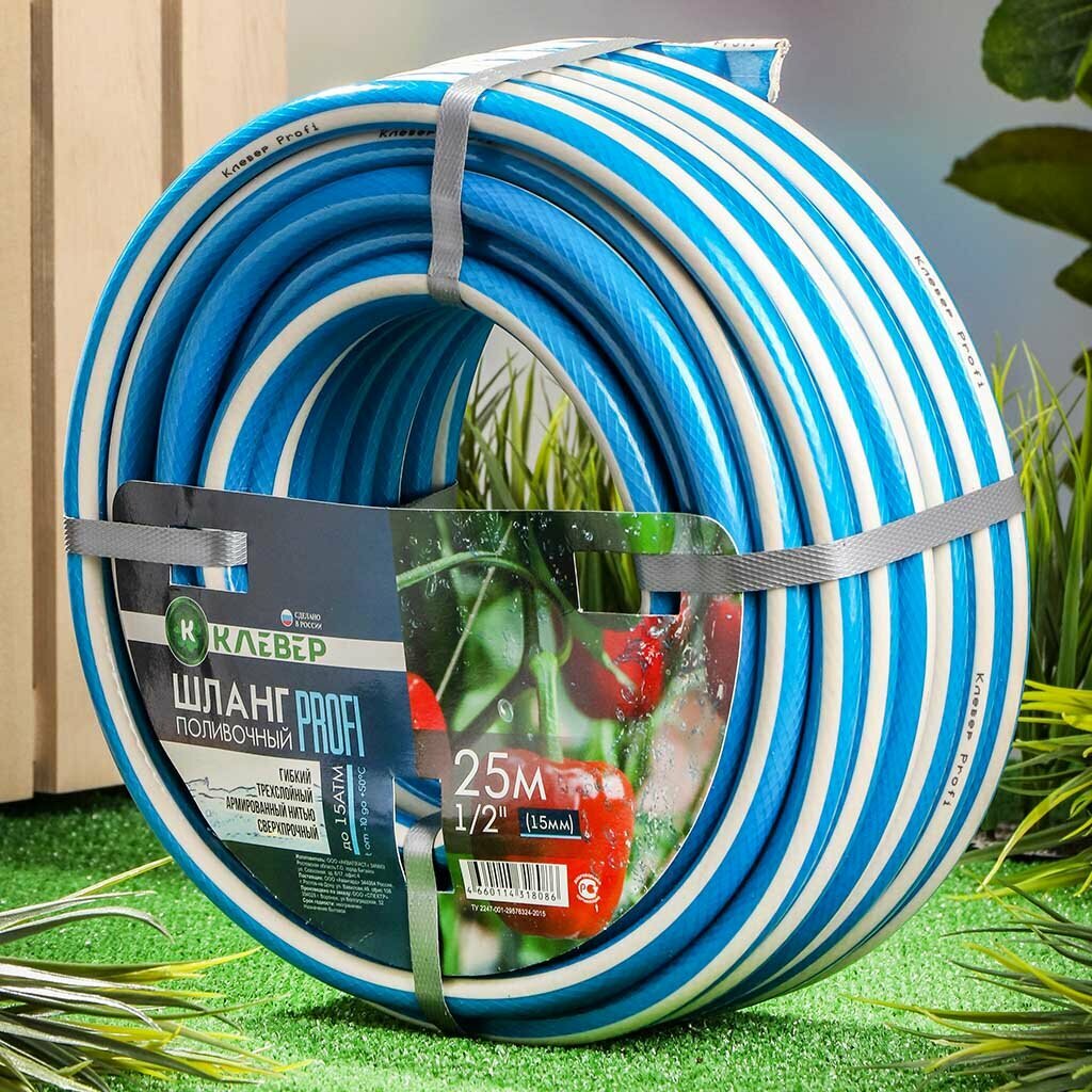 Шланг поливочный, 1/2 ', внутренний d15 мм, 15 атм, армированный, 25 м, 3 слоя, Клевер, Профи, ПВХ, бело-голубой