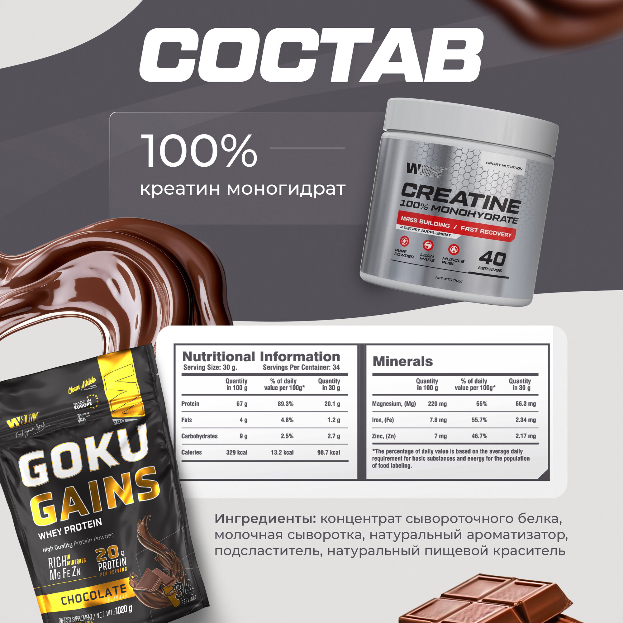 Комплекс протеин Шоколад + креатин 40 порций + Цинк (подарок)