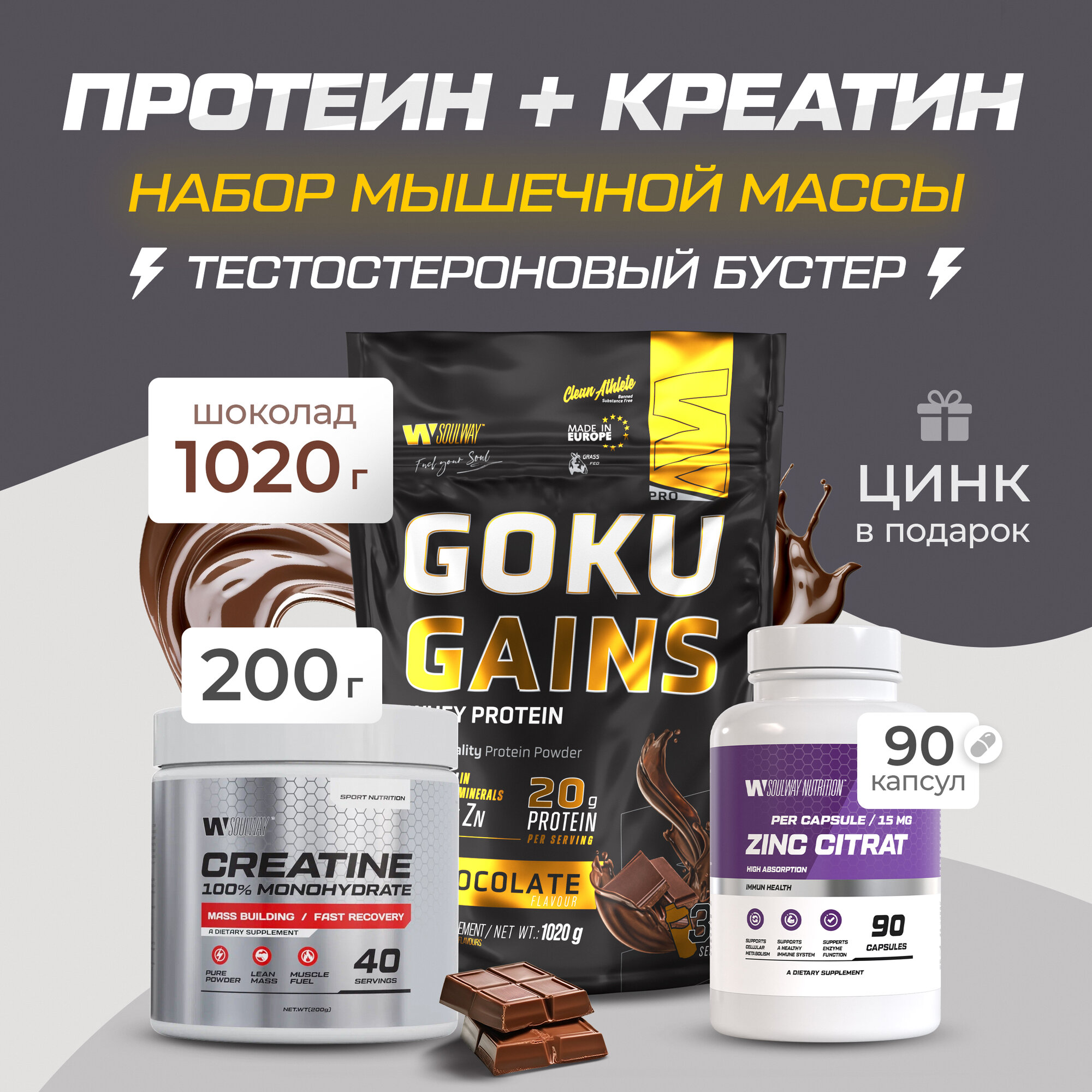 Купить Комбо набор Протеин сывороточный шоколадный 1020 гр 34 порций + Креатин моногидрат без вкуса 200 гр 40 порций + Цинк цитрат 90 капусл