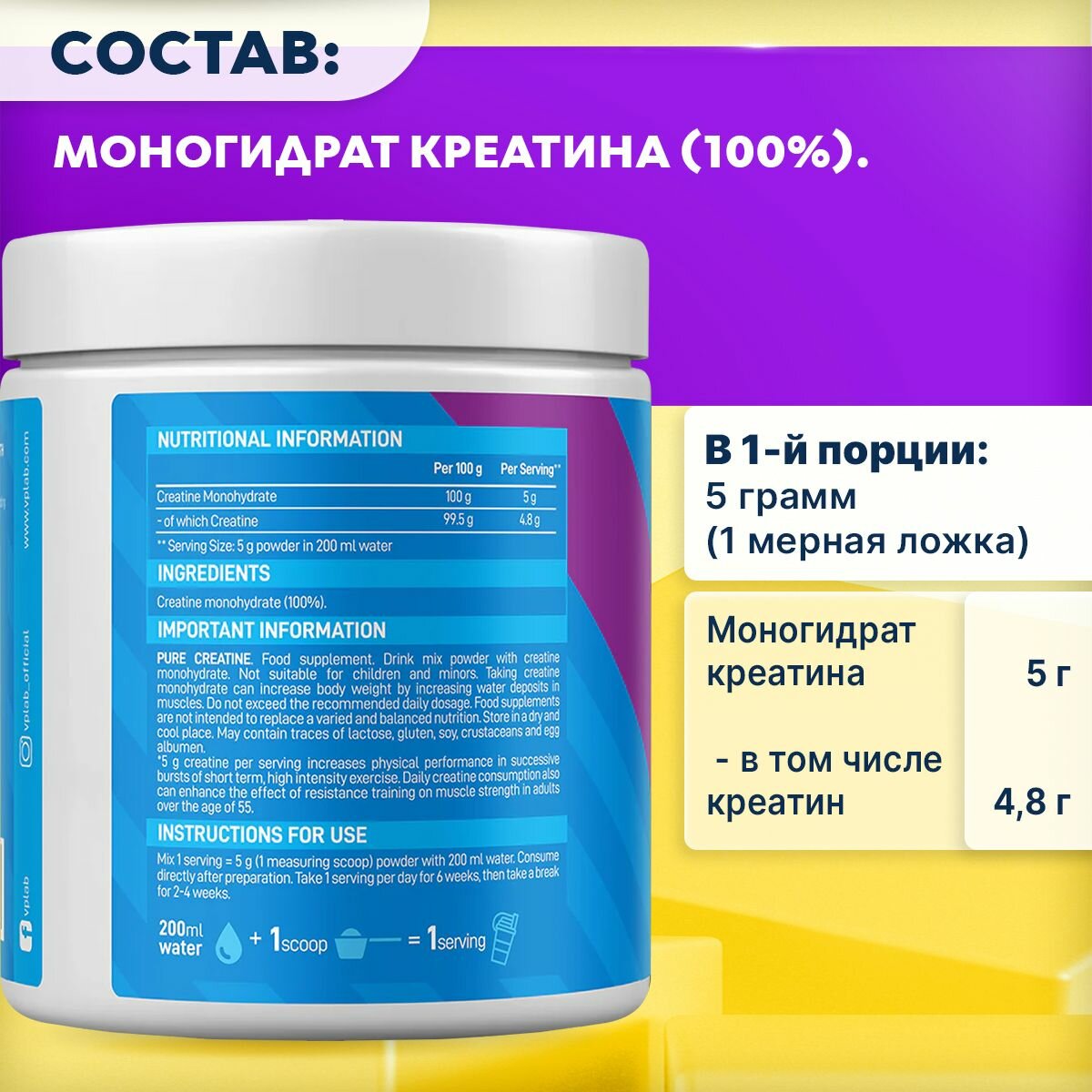 | Дополнительная информация | Чистый креатина моногидрат марки Creapure, представленный в ультра-микронизированной форме |
