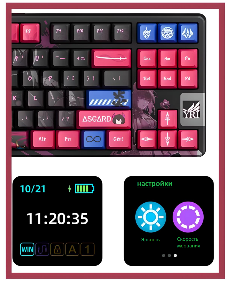 Тайпинг приятный. Свечи смазаны, пробел (и не только он) стабилизирован, прокладки есть. Сама конструкция клавиатуры упругая, отдача взаимная. По сравнению с моей прошлой на красных Kailh – это небо и земля. Мне этого достаточно с головой. Но, к слову, уверен, что существуют свечи ещё тише) Лед дисплейчик – прикольно. Установил свою гифочку, смотрится интересно. Чтобы это сделать, клавиатуру нужно подключить по USB. Размер гифки должен быть 128?128 пикселей. |