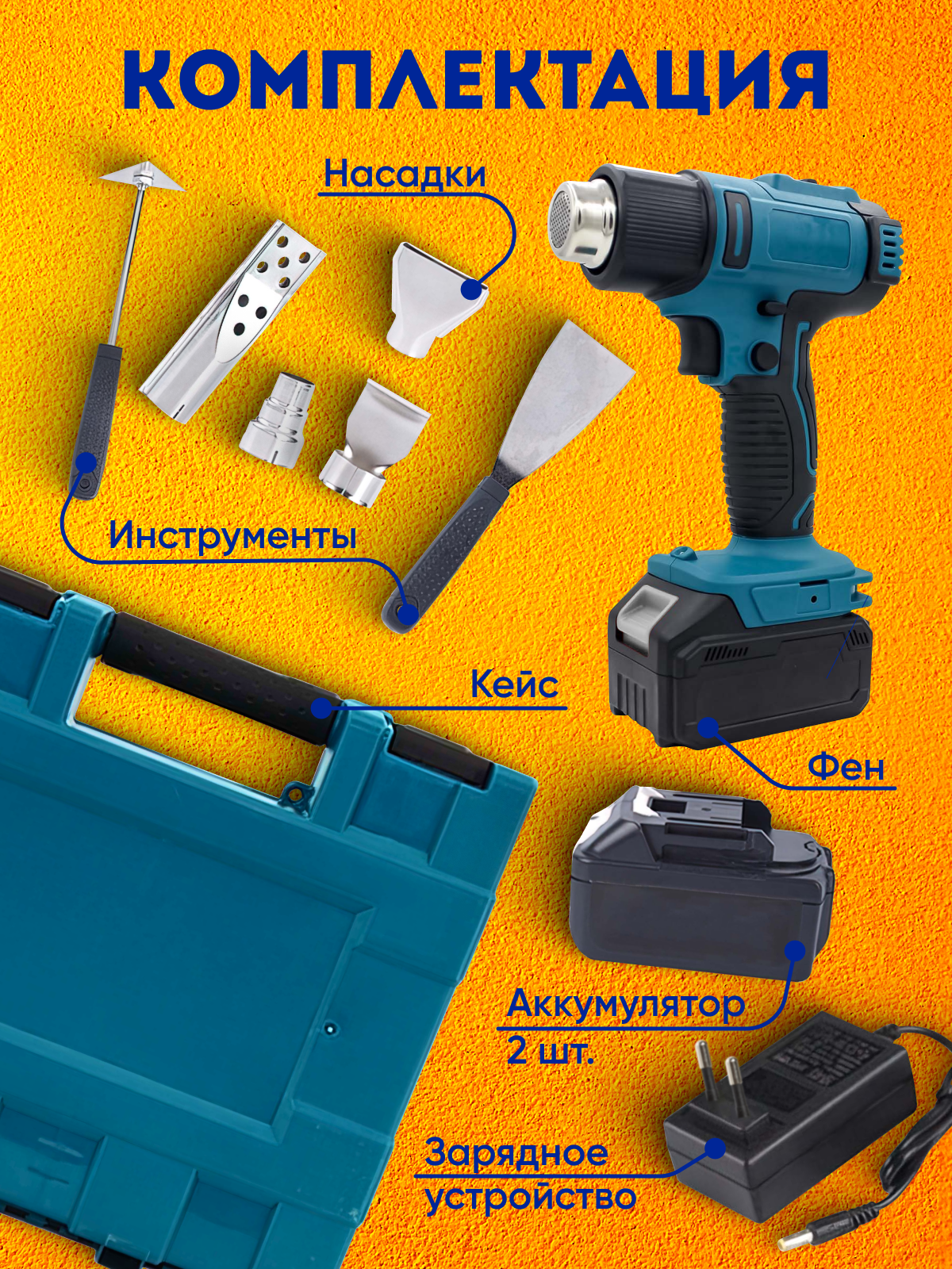 Фен строительный, с насадками и кейсом, термофен, строительный фен, набор инструментов