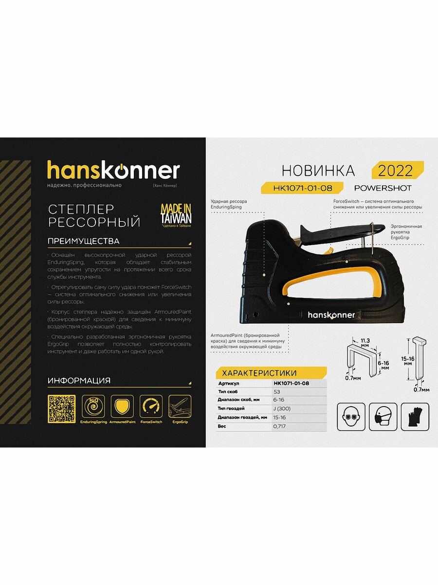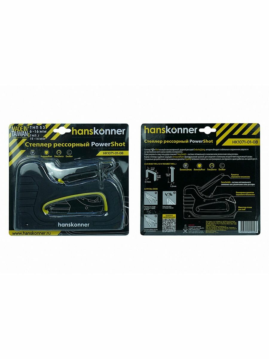 Степлер Hanskonner HK1071-01-08 усиленный, рессорный, скобы 53(6-16мм), гвозди 300(15-16мм)