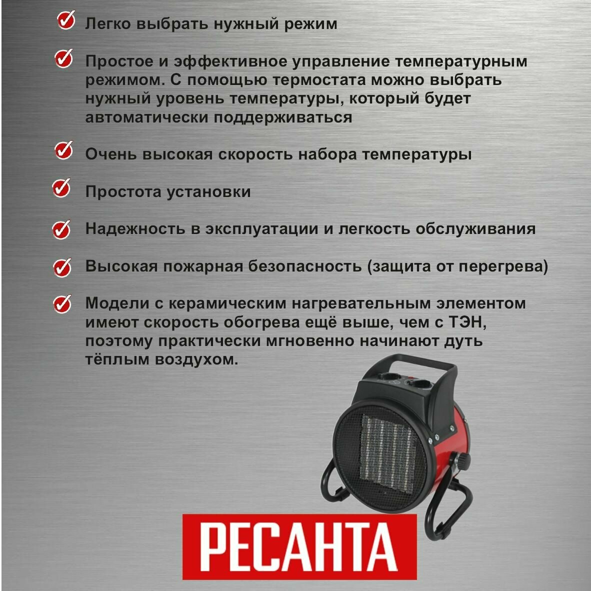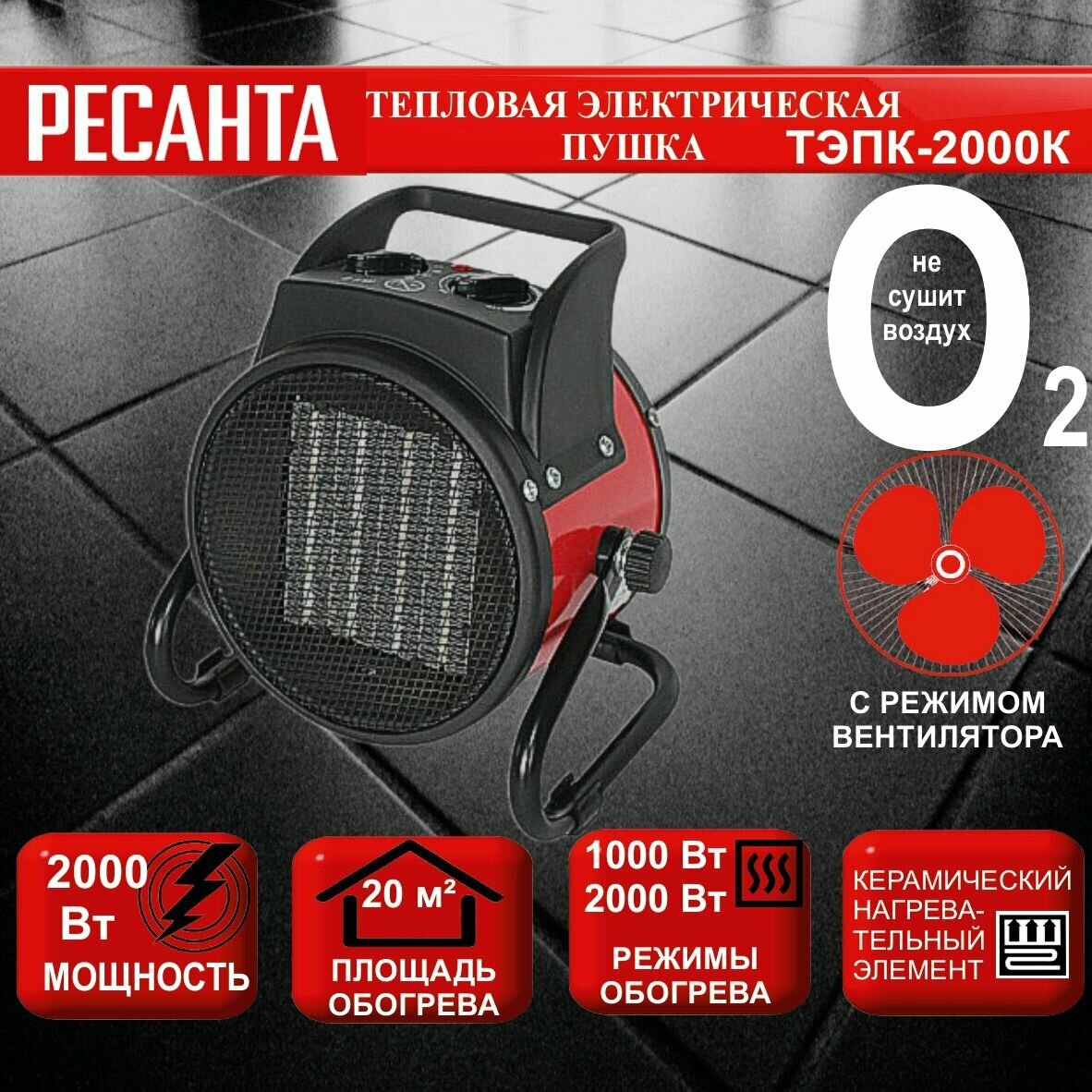 Пушка тепловая 2.0кВт 200куб.м_ч керамическая электрическая, РЕСАНТА ТЭПК2000K (1 шт.)