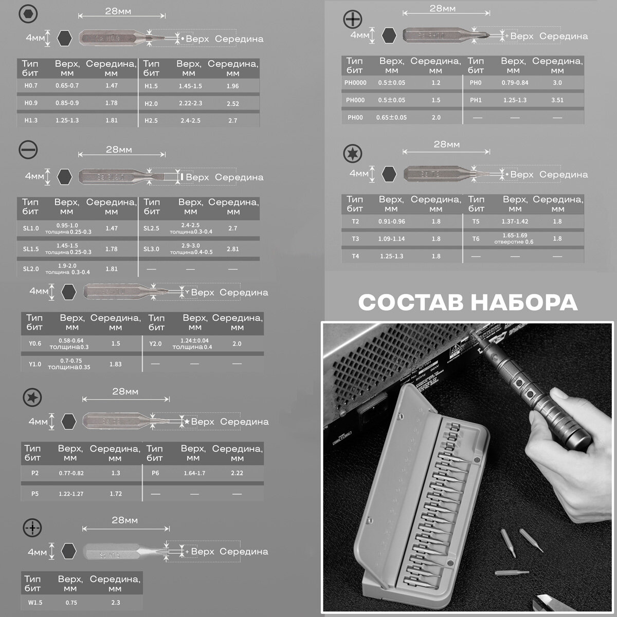 | Минусы: | Не работает намагничиватель бит (ну, или работает не со всеми битами). Пришлось выковыривать болтики чем придётся.