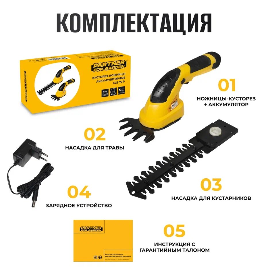 Кусторез, ножницы, аккумуляторный садовый для кустов, травы, газона Partner for Garden CGS-72